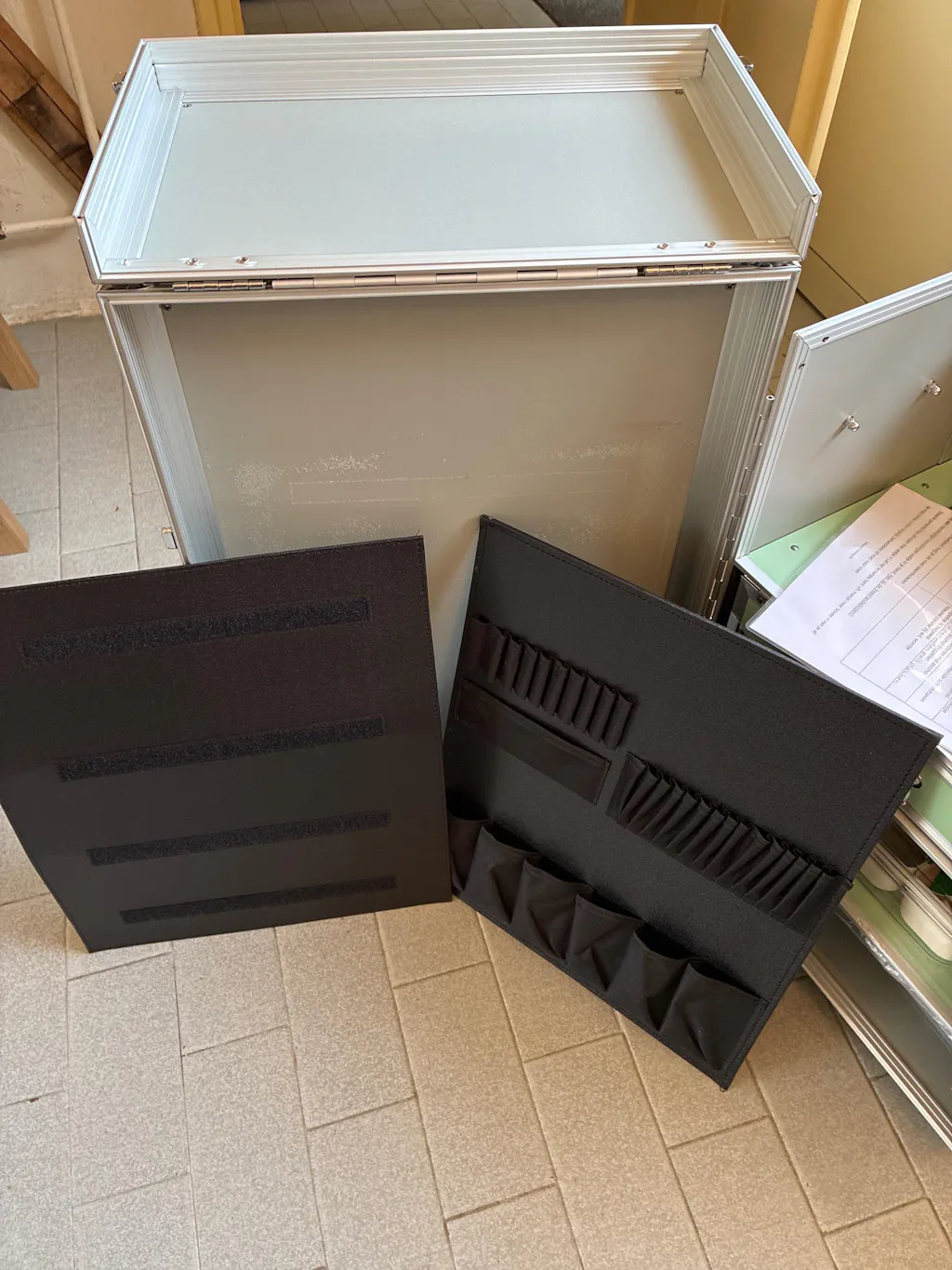 De koffer is mooi, stevig, kan veel in, maar het handvat is heel moeilijk in- en uit te schuiven. Ook is er een plaat waar een andere plaat met opbergvakjes tegenaan zit. Deze is met klittenband bevestigd. Het klittenband is echter zo sterk dat je beide platen meetrekt.