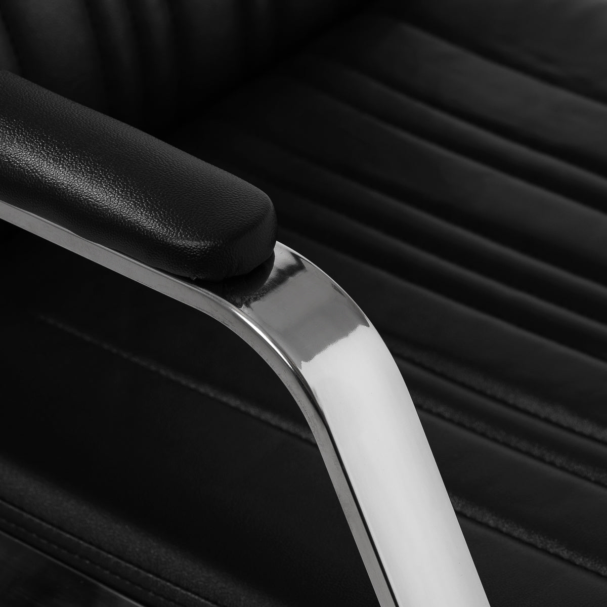 De comfortabele zitting is gevormd met duurzaam schuim en bekleed met zwart kunstleer voor langdurig comfort en gemakkelijk onderhoud. De gestoffeerde armleuningen bieden extra comfort en ondersteuning. De rugleuning is ergonomisch ontworpen en biedt optimale ondersteuning voor de rug. De stijlvolle stiksels op de bekleding benadrukken het moderne, auto-geïnspireerde design.